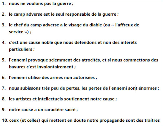 Ces 10 points sont tirés du livre de Anne Morelli, Principes élémentaires de propagande de guerre, paru en 2001 :