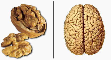 Les noix ressemblent à un cerveau, un hémisphère gauche et un droite, et le cervelet. Les plis et les rides d’une noix ressemblent à l’organe humain : le cerveau. Et ce n’est pas une surprise que les noix sont surnommés « nourriture du cerveau » – ils ont une teneur très élevée en acides gras oméga-3, qui protège et renforce le fonctionnement du cerveau. Une étude récente a révélé que l’extrait de noix démolit les plaques à base de protéines associées à la maladie d’Alzheimer.