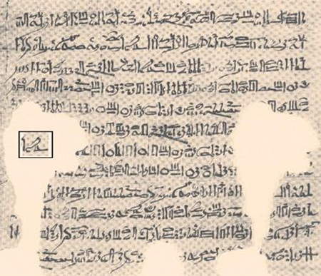Texte d’une page du calendrier du Caire; à l’intérieur du rectangle se trouve l’écriture hiératique du mot Horus. Un passage de ce document le date du règne de Ramsès II sous la dix-neuvième dynastie. Photo: Jetsu L. / Porceddu S.