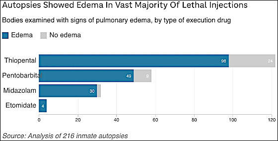 Le graphique ci-dessous (issu d’une image analysée) provient d’une enquête NPR (National Public Radio) publiée en septembre 2020, intitulée « Gasping For Air : Autopsies Reveal Troubling Effects Of Lethal Injection ». Il illustre précisément les résultats d’une analyse de 216 autopsies d’inmates (prisonniers) exécutés par injection létale aux États-Unis, entre 1990 et 2019 environ.