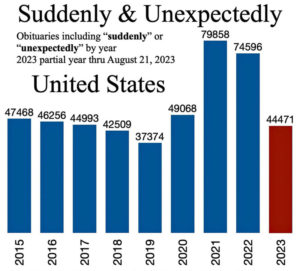 Les données concernent les notices nécrologiques datant de 2015. Le nombre de décès « soudains » ou « inattendus » a légèrement diminué chaque année jusqu’en 2019, où il s’élevait à 37.374. Toutefois, au cours de l’année covid 2020, le nombre a légèrement augmenté pour atteindre 49.068.