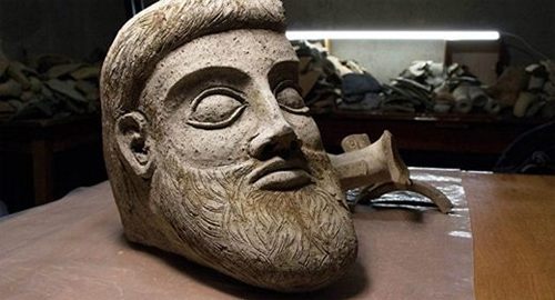 Grand fragment d’une sculpture en terre-cuite en forme de tête d’homme découverte Lors de fouilles sous-marines pendant la construction du pont de Kertch. Elle pourrait être la représentation d’un dieu grec.