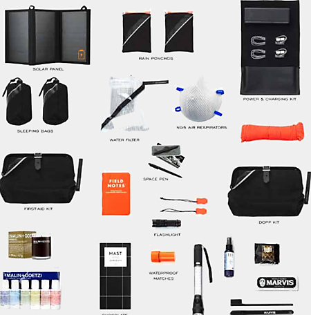 note que les acheteurs du sac d’urgence peuvent s’attendre à trouver un purificateur d’air personnel « éliminant les virus », un messager satellite Garmin, des lunettes de vision nocturne, un kit de panneaux solaires portables, des rationnements alimentaires Datrex et des masques N-95.
