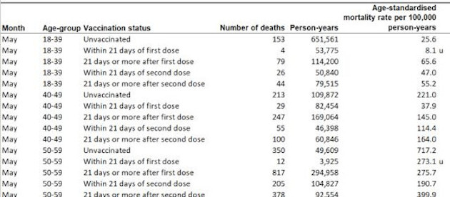 L’ensemble de données comprend également des « taux de mortalité standardisés selon l’âge par groupe d’âge et statut vaccinal pour tous les décès », mais ils ont commodément omis les données pour les enfants et n’ont inclus que des données sur les groupes d’âge de plus de 18 ans.