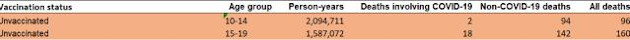 Mais ces chiffres sont en fait encore pires qu’ils n’y paraissent au premier abord, comme s’ils n’étaient pas déjà assez mauvais. En effet, le taux de mortalité non vaccinée chez les 10-14 ans comprend les enfants âgés de 10 et 11 ans qui ne sont pas admissibles à la vaccination.