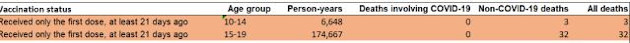 L’ONS a calculé que les années-personnes chez les 10-14 ans non vaccinés au cours de cette période étaient de 2.094.711, tandis qu’ils ont calculé que les années-personnes chez les 15-19 ans non vaccinés au cours de cette période étaient de 1.587.072.