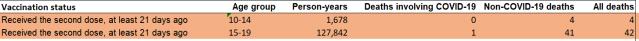 Maintenant, tout ce que nous avons à faire est d’utiliser la même formule pour calculer le taux de mortalité chez les 10-14 ans à deux doses vaccinés et les 15-19 ans, en utilisant les années-personnes et le nombre de décès fournis par l’ONS dans le tableau 9 de leur rapport « Décès par statut vaccinal », qui sont les suivants :