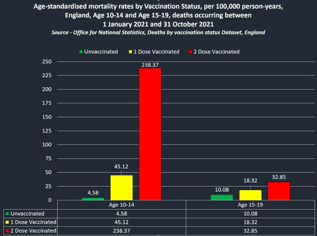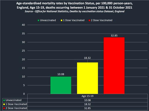 Ces chiffres sont horribles. Les données de l’ONS montrent qu’entre le 1er janvier et le 31 octobre 2021, les enfants âgés de 10 à 14 ans étaient statistiquement 10 fois plus susceptibles de mourir que les enfants non vaccinés, et les adolescents âgés de 15 à 19 ans étaient statistiquement 2 fois plus susceptibles de mourir que les adolescents non vaccinés.
