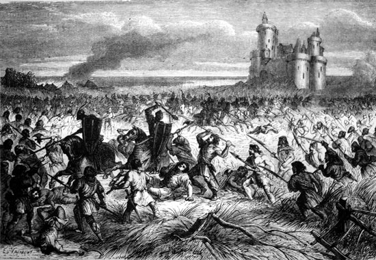 « Lors se assemblèrent et s’en allèrent, sans autre conseil et sans nulles armures, fors que de bâtons ferrés et de couteaux, en la maison d’un chevalier qui près de là demeurait. Si brisèrent la maison et tuèrent le chevalier, la dame et les enfants, petits et grands, et mirent le feu à la maison […]. Ces méchants gens assemblés sans chef et sans armures volaient et brûlaient tout, et tuaient sans pitié et sans merci, ainsi comme chiens enragés. Et avaient fait un roi entre eux qui était, si comme on disait adonc, de Clermont en Beauvoisis, et l’élurent le pire des mauvais ; et ce roi on l’appelait Jacques Bonhomme ».