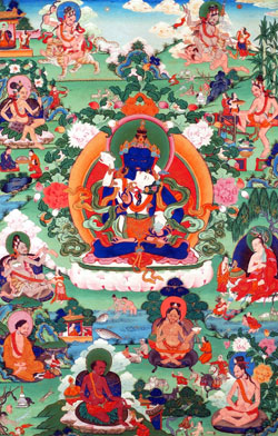 Dans cette manifestation, Padma-Sambhava a un corps bleu orné de soies et de bijoux. Il garde dans sa main droite au niveau du cœur un VAJRA, symbole des modalités de la connaissance et de la compassion, et dans sa main gauche une petite cloche qui symbolise la connaissance de la Vacuité. Il est dans une fusion extatique avec sa bien-aimée, dont le corps est d’un blanc pur et qui tient dans sa main gauche un crâne remplit de nectar, symbole de la mort définitive de l’ego. Ici, il incarne toute la tradition du VAJRAYANA, dont la source est Vajradhara ou, au Tibet, Dorje Chang, qui est le Suprême Maître Divin.