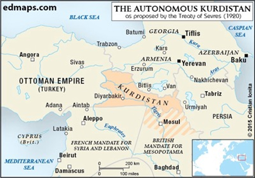 En 1917, la création du Kurdistan, de l’Arménie et d’Israël a été l’un des objectifs de guerre du président états-unien Woodrow Wilson. Après avoir envoyé la Commission King-Craine pour vérifier l’emplacement exact des populations, il a proclamé le Kurdistan par la Conférence de Sèvres (1920), ici en rose sur la carte. La conférence a également reconnu la possibilité que la zone hachurée (actuellement en Irak) se joigne volontairement au Kurdistan par référendum. Cependant, cet État n’a jamais vu le jour et a été abrogé par la Conférence de Lausanne (1923). Seul ce territoire, et seulement celui–ci, peut être légitimement exigé par les Kurdes.