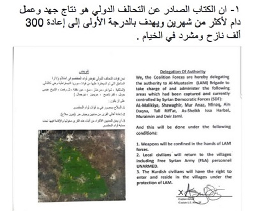 Un accord initié et négocié par les États-Unis entre une faction de l’Armée syrienne libre et les FDS sous commandement kurde établit les conditions qui ont permis à la brigade Mut’asim (Armée syrienne libre), d’investir 11 villages du nord de la Syrie, sous contrôle du rival FDS, en toute tranquillité. Le contenu de cet accord sans précédent a été annoncé le 10 mai 2017, déclarant que la Coalition sous commandement US a délégué à Al-Mu’tasim la responsabilité de l’administration des villages désignés.