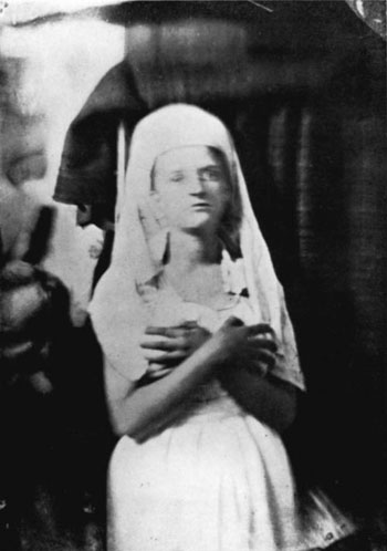 Certaines de ces photographies sont en la possession de l’auteur et il n’y a surement aucune impression plus merveilleuse sur une planche que celle qui montre Crookes à la hauteur de sa virilité, avec cet ange, car en vérité, elle était appuyée sur son bras. Le mot « ange » peut sembler exagéré, mais lorsqu’un esprit d’un autre monde se soumet au malaise de l’existence temporaire et artificielle afin de transmettre la leçon de la survie à une génération matérielle et mondaine, il n’y a plus de terme approprié.