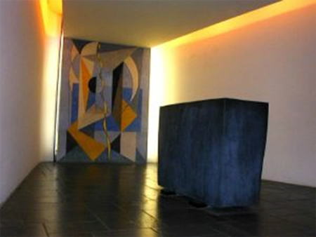 Il y a même, dans une petite pièce, appelée la « meditation room », un autel satanique (mais on ne la vend pas comme cela sur le site de l’ONU, on dit qu’il s’agit d’une salle ouverte à toutes les religions). La peinture abstraite au fond montre une faucille, qui représenterait le sacrifice humain et la planète Saturne. 10 sièges qui représenteraient les 10 rois satanistes quand l’ONU aura pris le pouvoir font face à l’autel.