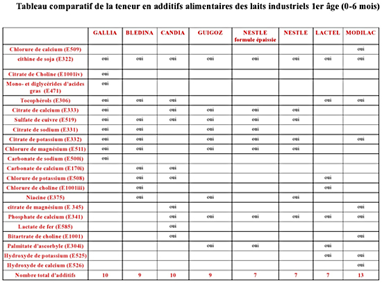 Tableau comparatif de la teneur en additifs alimentaires des laits industriels 1er âge
