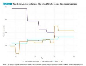« Il existe aujourd’hui quatre sources de données publiées en open data par trois institutions différentes sur la couverture vaccinale contre le Covid-19 en France : en rapportant la population vaccinée aux estimations de population de l’Institut national de la statistique et des études économiques (Insee), la part de personnes non-vaccinées au 14 août 2022 serait de 6,5 % chez les 18 ans ou plus selon les chiffres de Santé publique France et 6,6 % selon la Caisse nationale de l’Assurance maladie (CNAM) ; 7,0 % des 20 ans ou plus seraient non vaccinés selon la Direction de la recherche, des études, de l’évaluation et des statistiques (DREES) ; enfin, la CNAM estime que 13,9 % de la population des 20 ans ou plus ayant consommé des soins remboursés en France en 2021 serait non vaccinée à la même date. Les trois premières sources donnent ainsi des estimations nationales convergentes au global, même si on constate des écarts plus importants par groupes d’âges. Les profils par âge de la part de personnes non-vaccinées sont par ailleurs très différents entre les trois premières sources et la quatrième. »