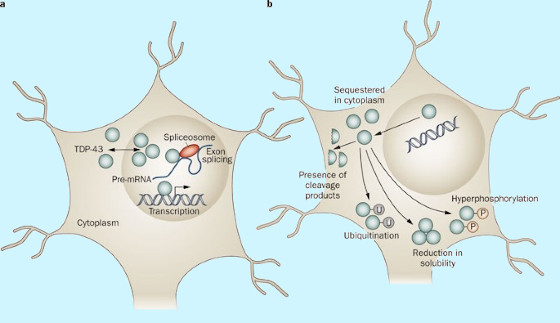 La sclérose latérale amyotrophique ou SLA est une maladie des motoneurones hautement débilitante. La caractéristique pathologique de la SLA est la présence d’inclusions dans le cytoplasme des neurones moteurs spinaux survivants. Là encore TDP-43 (encore nommée TAR DNA-binding protein-43) est la protéine majeure trouvée dans ces inclusions cérébrales post-mortem de patients atteints de SLA. Les RRM sont deux motifs de reconnaissance à l’ARN. L’altération pathologique (repliement anormal puis agrégation) de TDP-43 est considérée comme une caractéristique des maladies neurodégénératives de la sclérose latérale amyotrophique (et de la dégénérescence lobaire fronto-temporale).
