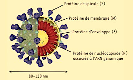 Note du traducteur : À propos de la protéine N mentionné ci-dessus, elle est un constituant du virus du Sras-CoV-2 qui possède une enveloppe en forme de couronne formée des protéines S (spicule) nommées Spike, des protéines M (membranaire) et des protéines E (enveloppe), ainsi que des nucléoprotéines N (nucléocapside hélicoïdale) qui entourent le génome à ARN du virus Sras-CoV-2 :