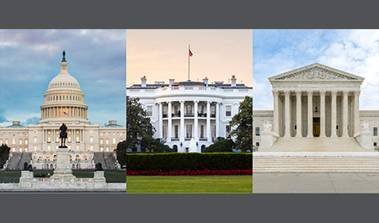 Le Capitole des États-Unis (G), la Maison-Blanche (C), et le bâtiment de la Cour Suprême