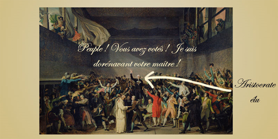 Alors, certains diront que : « nous sommes dans une démocratie représentative, donc c’est une démocratie ». Rappelons tout de même que les mots démocratie et représentative assemblés ne veulent rien dire. En effet, cela serait comme dire une liberté en incarcération, un avion terrestre, le matin du soir, un petit grand, etc. Lorsque l’on associe deux mots de sens contraire, on appelle ça un oxymore. C’est très bien pour faire des figures de style dans un texte littéraire, c’est plutôt manipulatoire lorsque c’est employé pour définir un type de régime politique. Souvenez-vous de la fameuse « guerre propre » lancée par les Américains contre l’Irak…