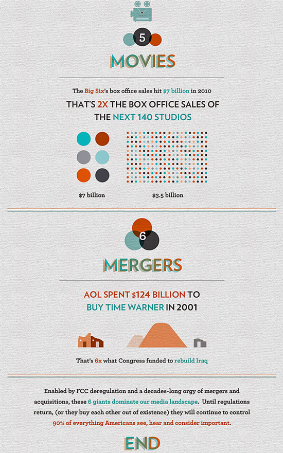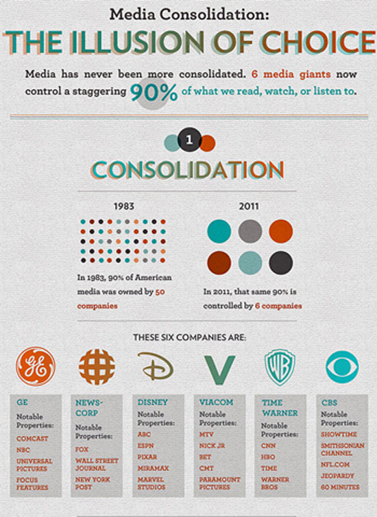 Ce graphique créé par Jason sur le site FrugalDad.com montre que pratiquement tous les médias sont détenus par 6 sources, fusionnées à partir de 50 sociétés (en 1983, 90% des médias étaient détenu par 50 sociétés).