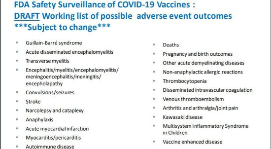 Note du traducteur : La FDA a émis dans sa Présentation de la réunion de la commission du 22 octobre 2020, un avis sur les vaccins et produits biologiques connexes, ***Sous réserve de modifications***. Pour ce qui concerne la surveillance de l’innocuité des vaccins Covid-19, le rapport de la FDA liste — dans une ébauche — la survenue possible d’effets indésirables, dont la mort ; cette liste se trouve à la page 16 dudit rapport, d’où est tiré l’image ci-dessus :