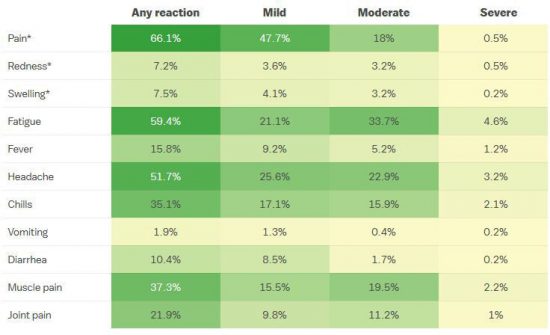 La fréquence des réactions secondaires est élevée : 59 pour cent éprouvent de la fatigue, 52 pour cent des maux de tête, 37 pour cent des douleurs musculaires. Presque tous les patients ont ressenti des réactions secondaires. La gravité des symptômes est également assez effrayante. Par exemple, 38 pour cent des sujets jeunes et en bonne santé ont éprouvé une fatigue modérée à forte et 26 pour cent des maux de tête modérés à forts. « modéré » signifie interférer avec l’activité et « grave » signifie empêcher l’activité quotidienne.
