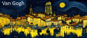Pour prendre un exemple parmi des centaines disponibles à présent, un développeur web s’est ainsi amusé à demander à MidJourney la ville de Lyon dans le style de différents peintres connus (Dali, Van Gogh, Monet, Giger) ou selon différents contextes (apocalyptique, futuriste, etc.) ce qui donne une série d’illustration particulièrement illustrative des capacités de ce genre de moteurs.