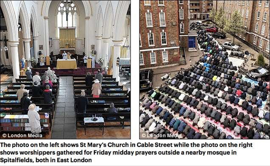 Le Daily Mail a publié des photographies d’une église et d’une mosquée à quelques mètres l’une de l’autre au coeur de Londres. À l’église de San Giorgio, conçue pour accueillir 1230 fidèles, seulement 12 personnes se sont rassemblées pour célébrer la messe. À l’église de Santa Maria, il y en avait 20.