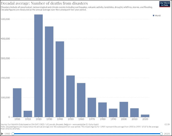 Pensez donc : comme l’indique très bien l’AFP dans son petit notule poussivement écrit avec les sourcils froncés et un petit bout de langue sortie au coin des lèvres, il est sûr et certain que « Les produits chimiques, les plastiques et la pollution atmosphérique étouffent la terre, l’eau et l’air », tandis que « le réchauffement de la planète dû à la combustion des énergies fossiles » (et pas du tout ni au soleil ni à des cycles multi-centenaires sur lesquels l’humanité n’a aucun levier) « provoque un chaos climatique – des vagues de chaleur et feux de forêt aux sécheresses et aux inondations » comme en atteste d’ailleurs le graphique suivant de Our World In Data :