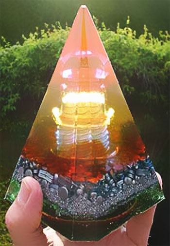 Disons rapidement que le métal attire et repousse à la fois le DOR, et que cette énergie traverse alors des couches successives de métal et de longues chaînes moléculaires de polymères à base de carbone (la résine). Ce faisant, l’énergie est excitée et son taux vibratoire augmente, la purifiant ainsi en quelque sorte. Les cristaux et les pierres servent ensuite à « colorer » et diriger l’énergie purifiée dans l’environnement.