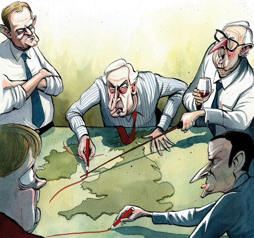 Mais identifier les tireurs des ficelles externes, qui sont les grands profiteurs de ce jeu sordide, est beaucoup plus difficile pour le moment. Ce sont précisément ceux-là qui se tiennent dans le coin supérieur du conflit triangulé, en restant loin des yeux du grand public. Ce sont les centres de pouvoir occidentaux, qui ont tracé le chemin à sens unique qui mène à notre ruine. Nous pouvons appeler cela oligarchie planétaire, corporatocratie, élite mondiale, la mafia des banquiers ou Grand Capital, mais tous ces noms peuvent paraître abstraits et, en outre – horribile dictu ! – être associés avec la « théorie du complot ». Or, nous sommes des gens civilisés et ne croyons pas à l’existence de ce genre des choses. Nous allons donc mentionner les noms des outils institutionnels de cette entité apparemment nébuleuse : l’Union Européenne, les USA, l’OTAN, le FMI, la Banque mondiale, l’Organisation Mondiale du Commerce, le Conseil de l’Europe, la malsaine mafia internationale du « réseau Soros », etc.