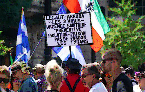 Plusieurs affichaient des slogans hostiles aux autorités, aussi bien envers le premier ministre du Québec que le directeur national de la santé publique, Dr Horacio Arruda. Ils en avaient également contre les grands médias qu’ils accusent de propager de fausses nouvelles.