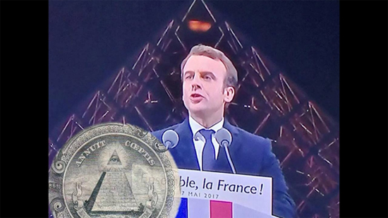 Ensuite il y a le symbole de la pyramide à la tête tronquée. Elle signe son appartenance à la Franc-maçonnerie mondiale. Il appartiendrait à l’Ur-lodge Fraternité verte et à la « super-loge » Atlantis Aletheia où l’introduisit le maçon talmudique Jacques Attali (1) et participa à une « tenue blanche fermée » du Grand Orient de France en 2016. Cela dit, la plupart des hommes politiques ne s’allient à la Franc-maçonnerie que par intérêt politique, comme les hommes d’affaires le font par intérêt économique. Macron est debout derrière le pupitre en pyramide tronquée où est dissimulé l’écran du prompteur ; il a demandé aux services techniques de placer l’estrade à une distance telle que sa tête, vue de ses admirateurs, se trouve à l’emplacement de la pointe de la pyramide du Louvre.