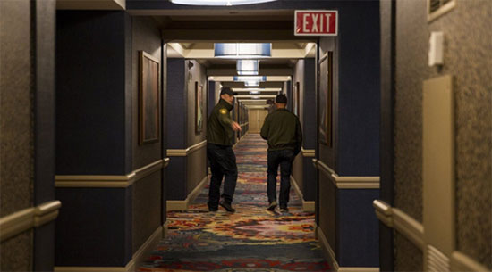 Campos a traversé le couloir en direction des portes menant à l’escalier, ces dernières jouxtant les doubles portes de la suite de Paddock. Il a ouvert la première porte et a inspecté la seconde (qu’il n’avait pas réussi à ouvrir depuis l’autre côté, quelques minutes auparavant). Il a compris le problème : la porte avait été bloquée avec un support en métal. Alors qu’il se tenait sur le palier, dans l’espace entre les deux portes, Campos a appelé la maintenance de l’hôtel et l’a informée de la situation. Un ingénieur, Stephen Schuck, a été dépêché sur les lieux. Relatant les événements dans l’émission Ellen Show, Campos a affirmé que tandis qu’il se trouvait entre les deux portes de la cage d’escalier, il a entendu « comme des bruits de perceuse ».