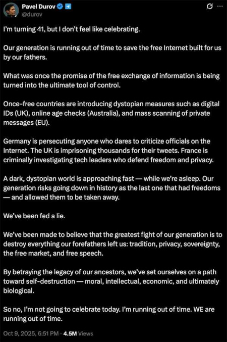 Une complainte d’anniversaire se transforme en manifeste alors que Durov met en garde contre la disparition de la frontière numérique.