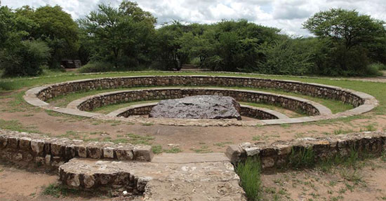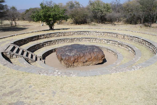 Dans la même région que Tsumeb, et dans un registre tout à fait différent, se trouve la météorite de Hoba. C’est la plus grande du monde et elle pèse 60 tonnes. L’objet est majoritairement composé de fer.