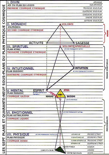 Dans ce graphe, vous voyez 7 plans principaux divisés chacun en 7 sous-plans. Le monde physique n’est représenté que par 3 sous-plans au bas du graphique : « dense, liquide et gazeux ». La ligne pointillée au-dessus du gaz représente le plasma, un sous-plan transitoire, ensuite les 4 sous-plans au-dessus de cette ligne pointillée font partie du plan Éthérique. Puis nous avons les 7 sous-plans au-dessus (monde émotionnel) qui font partie du plan Astral.