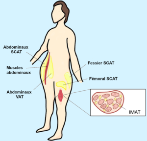 Je vais (encore) simplifier ces deux formes de surpoids (et de distribution de l’adiposité) avec le graphique ci-dessous : à droite, la forme glutéofémorale (qui concerne les fesses et les cuisses ; certains disent forme « gynoïde ») et, à gauche, la forme abdominale (qui concerne surtout le tour de taille ou forme « androïde »).