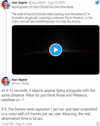 Alors que le cosmonaute russe Ivan Vagner, qui se trouve actuellement à bord de la Station spatiale internationale (ISS), filmait une aurore au-dessus de l’Antarctique, plusieurs lumières étranges ont été aperçues. Le clip de 60 secondes, filmé depuis l’ISS, montre au moins cinq points mystérieux se déplaçant à l’unisson, se dirigeant derrière la Terre, du point de vue de M. Vagner.