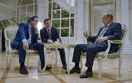 The Putin Interviews a commencé en juin 2015. Nous venions de terminer de tourner Snowden – nous sommes allés à Moscou pour filmer la dernière scène avec Ed Snowden. Nous sommes restés quelques jours de plus et nous sommes allés au Kremlin voir M. Poutine pour notre premier entretien. Puis nous avons prolongé ce voyage de deux jours et donc nous avons eu plusieurs interviews. Nous y sommes retournés au début de l’année suivante et au milieu de 2016 – et chaque fois, différentes interviews, à Sotchi… dans la datcha – c’était attrape ce que tu peux. Son temps était très restreint ; il travaille de longues heures. Souvent, il partait à une heure du matin et disait : « J’ai une autre réunion. »