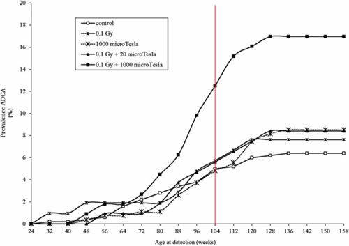 (a) Une augmentation significative, en corrélation avec les doses reçues, des adénocarcinome mammaire (cancer du sein) chez les mâles et les femelles, en particulier chez les mâles exposés à 20μT et à 0.1Gy et chez les femelles exposées à 1000μT en plus de 0.1 Gy.