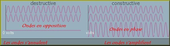 Comment se les présenter? Lorsque deux ondes électromagnétiques de même fréquence et de phase décalée de 180° sont émises en parallèle l’une à l’autre, elles s’annulent l’une l’autre : quand l’une vibre dans un sens, l’autre vibre dans le sens opposé, à chaque instant et chaque endroit de l’espace le long de leur trajet.
