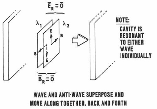 La résultante est nulle et produit une onde se propageant dans la même direction, mais ne vibrant plus: une onde scalaire. Oui, car chaque onde électromagnétique véhicule une énergie et la résultante des deux annule le mouvement de vibration, mais les énergies s’additionnent, donc il subsiste quelque chose qui ne vibre plus et se déplace en ligne droite: c’est ça une onde scalaire.