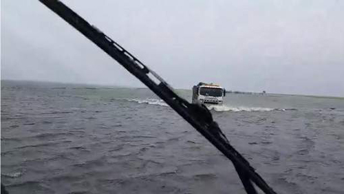 La preuve en images. James Weeding a filmé sa « traversée de l’océan » alors qu’il circulait pourtant sur la « Great Northern Highway », soit la principale autoroute de la zone. Autour de lui, la mer à perte de vue et une sorte d’îlot au loin… avant qu’un camion ne croise sa route.
