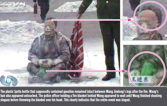 Le 23 janvier 2001, au moment des fêtes du Nouvel An chinois, survient un incident majeur qui va marquer les esprits. Sept personnes tentent de s’immoler par le feu sur la place Tian’anmen. Les sources du gouvernement chinois annoncent alors que ces personnes étaient pratiquantes de Falun Gong. Les sources de Falun Gong contestent cette affirmation en soulignant que leurs enseignements interdisent toute violence ou suicide. Plusieurs journalistes et universitaires occidentaux ont également noté des incohérences dans la version du gouvernement chinois de l’incident qui ont conduit beaucoup parmi eux à croire à une mise en scène du gouvernement chinois pour discréditer le Falun Gong et retourner l’opinion publique contre cette pratique. En particulier, Ian Johnson du Wall Street Journal, Danny Schechter et David Ownby ont attiré l’attention sur le fait que l’agence Xinhua a diffusé une déclaration déjà traduite en anglais seulement deux heures après l’incident. Ceci est très inhabituel pour ce genre de reportage qui doit être approuvé par plusieurs instances bureaucratiques, ce qui laisse penser que les autorités chinoises étaient prêtes à rapporter l’événement. Philip Pan du Washington Post a quant à lui enquêté dans l’entourage de deux des auto-immolées et découvert que personne ne les avait jamais vues pratiquer le Falun Gong. Il a également noté que le gouvernement chinois a toujours refusé que des journalistes étrangers interrogent les survivants de l’incident.