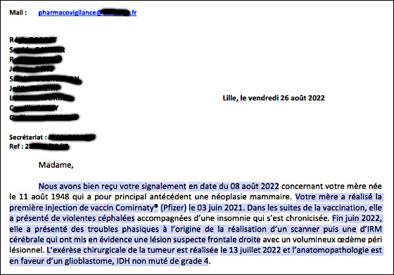 Alors évidemment, au moment du diagnostic, rien ne permettait d’établir à priori un lien de causalité entre ses trois injections de vaccins ARNm covid et l’apparition de son glioblastome. Néanmoins, c’est un fait que l’apparition d’un glioblastome, dans les mois qui suivent une vaccination, est par définition un événement indésirable qui peut être envisagé comme un effet indésirable de la vaccination. Si avoir un glioblastome n’est pas indésirable, qu’on me le dise.