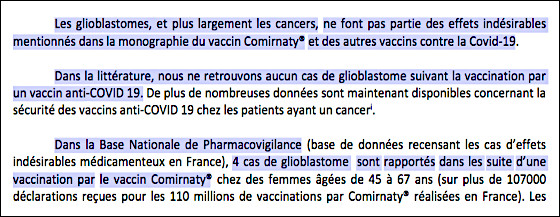 Mais même sans ces éléments, il apparaît à ce stade que dire, comme se contente de le faire le centre de pharmacovigilance de Lille qu’il n’y a que 4 cas de glioblastome déclarés en France, et que dès lors, « le lien est difficile à établir », relève du pur foutage de gueule ou, pour le dire plus poliment, cela révèle toute la limite et la différence entre la pharmacovigilance dite « passive » (il revient aux injectés estimant avoir potentiellement subi un effet indésirable du vaccin de se manifester), et la pharmacovigilance active (les autorités sanitaires entreprennent une étude pro-active à partir des données à leur disposition), ce qui aurait pu et dû être la règle.