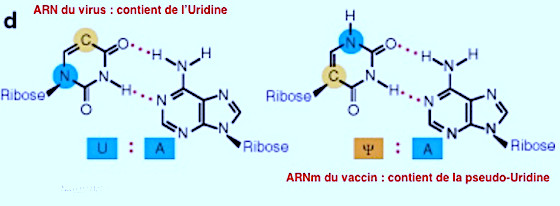 Les fabricants ont opté pour la substitution des uridines de l’ARNm viral par des pseudo-uridines qui augmentent sa stabilité. Il existe naturellement des substitutions par des pseudo-uridines mais jamais de façon systématique comme ici. Des pseudo-uridine synthase sont capables de synthétiser in vivo de l’ARNm modifié dans certaines conditions de stress cellulaire (3). Cette transformation des uridines semble vraiment fondamentale (4). Il y a un équilibre à trouver entre l’immunogénicité et les effets indésirables.