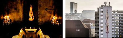 Ce thème décliné d’ailleurs depuis peu sur un autre mural à Bruxelles (photo de droite), est tiré de l’histoire atroce de la comtesse sanglante qui avait fait plus de 600 victimes vierges (et donc au moins adolescentes) en son temps : Peut-on parler d’un hommage aux « maîtres » derrière la création de l’Europe ? Ça en a tout l’air. A gauche une scène du film Hostel II et à droite le mural « artistique » à Bruxelles.